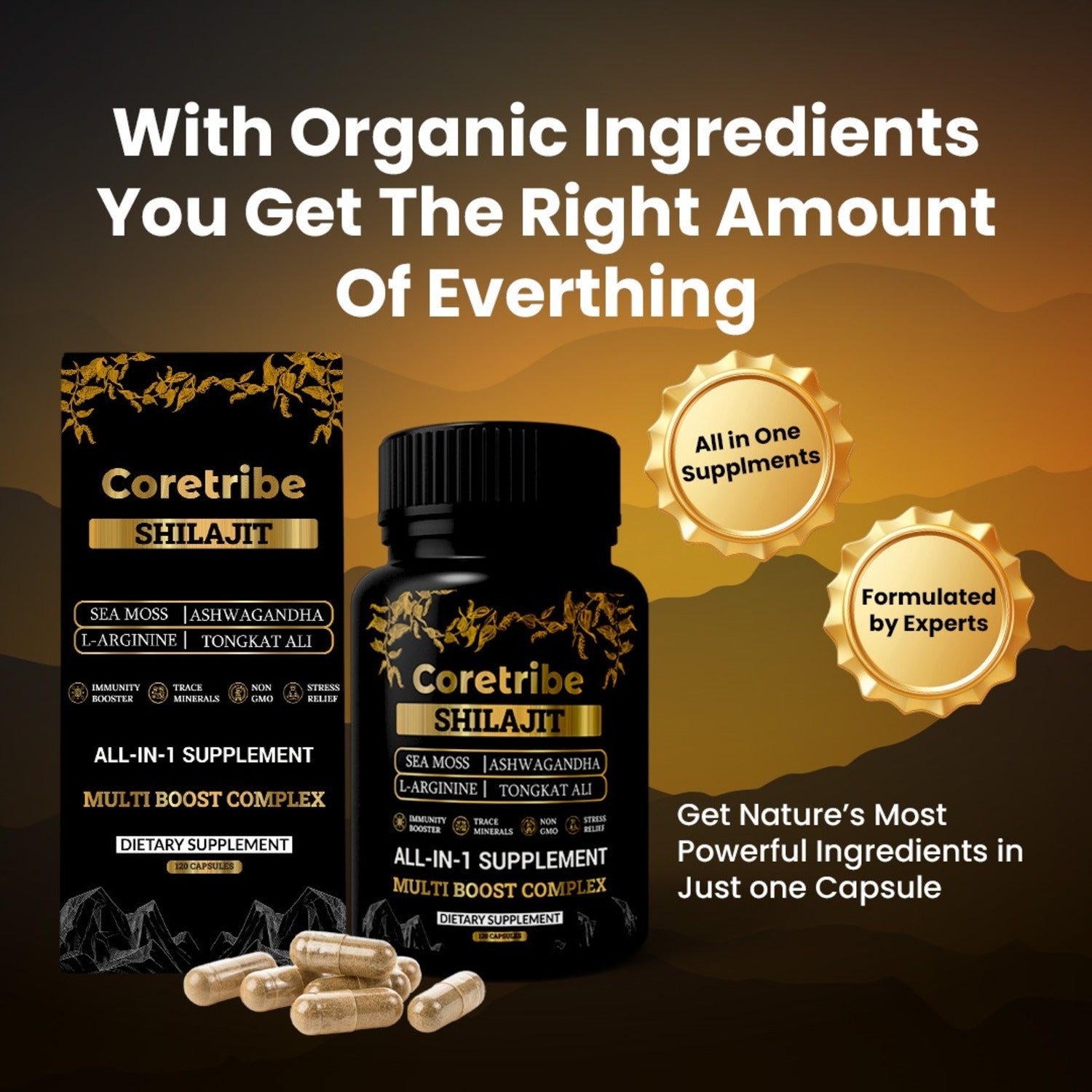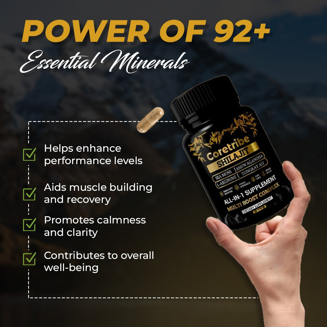 CoreTribe Shilajit Capsules with Sea Moss & Ashwagandha are a premium 10-in-1 natural herbal dietary supplement designed to support daily energy, stamina, focus, immune balance, and overall wellness. This advanced formula is crafted for both men and women who want a clean, all-in-one supplement to support an active lifestyle, fitness goals, and everyday health — without managing multiple products.